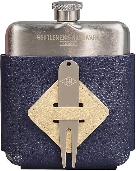 Wrapped in premium leather, this stainless steel flask features a removable cover, belt/bag loop for easy carrying on the course, two golf ball markers, four tees, and a divot repair tool.